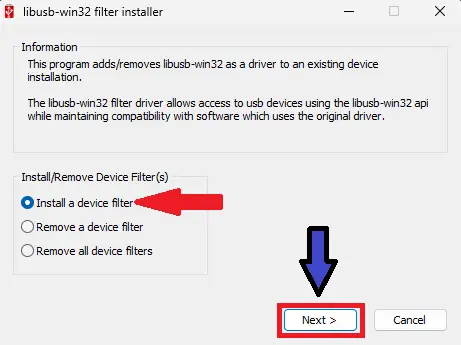 libusb-win32-devel-filter-1.2.6.0.exefile run kare- Next par click kare