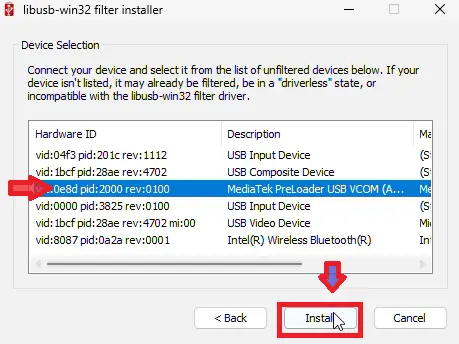 - LibUSB window me mein aapko “MediaTek Preloader” ya “MTK USB Port” (jo bhi dikhe) use select kare.
