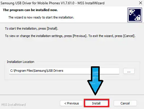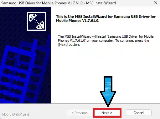 Samsung-USB-Driver.exepar double-click kare- Welcome screen par Next click kare
